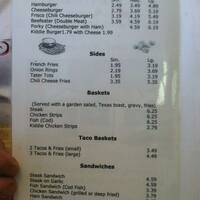Pat's drive in menu. Check with this restaurant for current pricing and menu information. I didn't post a picture of the burger as whatever you order will come wrapped in foil and place in a white bag. Ice cream cup, fish basket (cod fish), burgers, salads, ice cream cone, hamburger, cheeseburger salad, baskets, dogs and such, hot dog, steak.